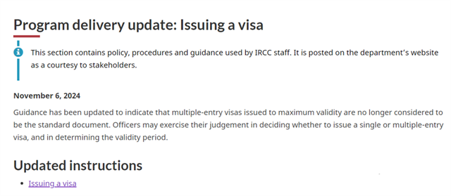 加拿大官網(wǎng)于2024年11月6日發(fā)布的簽證