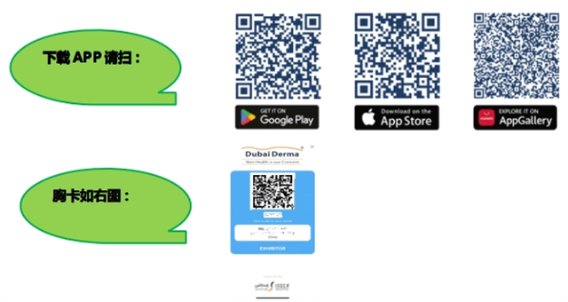 展商證領(lǐng)?。?/strong>所有參展商都需要開(kāi)展之前在網(wǎng)上預(yù)先注冊(cè),再?gòu)氖謾C(jī)下載 APP 導(dǎo)出(請(qǐng)搜索 DUBAI DERMA),截圖胸卡存在手機(jī)相冊(cè),進(jìn)館掃胸卡上的二維碼進(jìn)入。